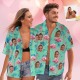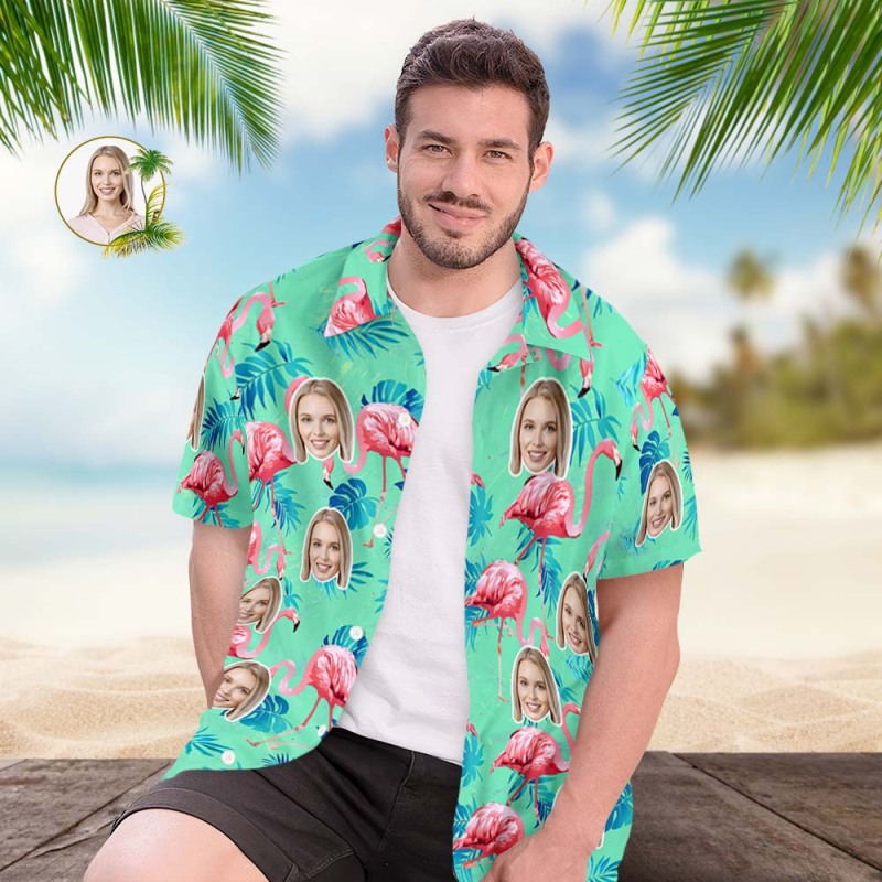 客製化臉夏威夷襯衫火烈鳥熱帶襯衫情侶裝全印花綠色和棕櫚葉