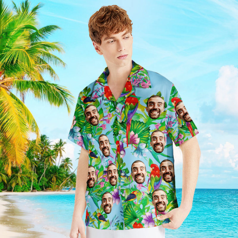 客製化臉襯衫男式夏威夷襯衫彩色鸚鵡男裝
